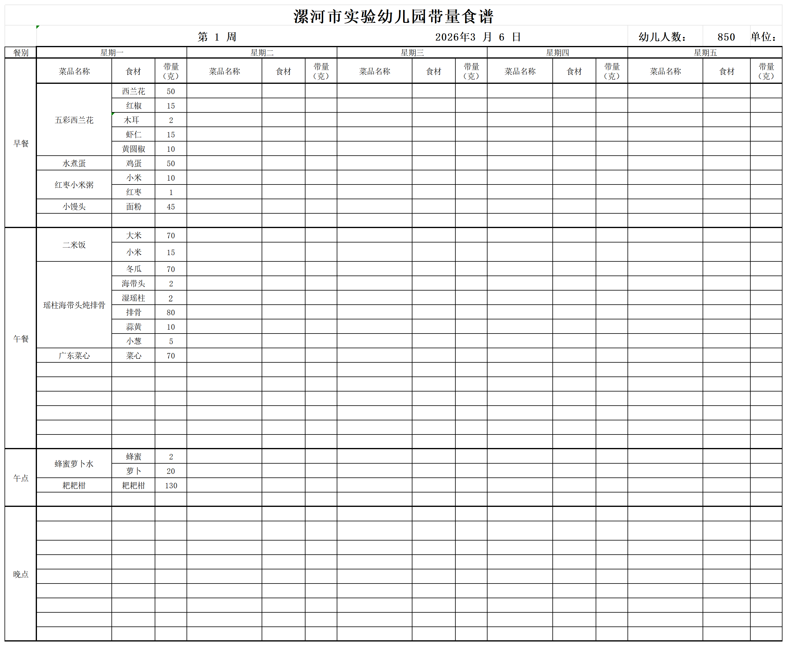 漯河市实验幼儿园3月6日带量食谱