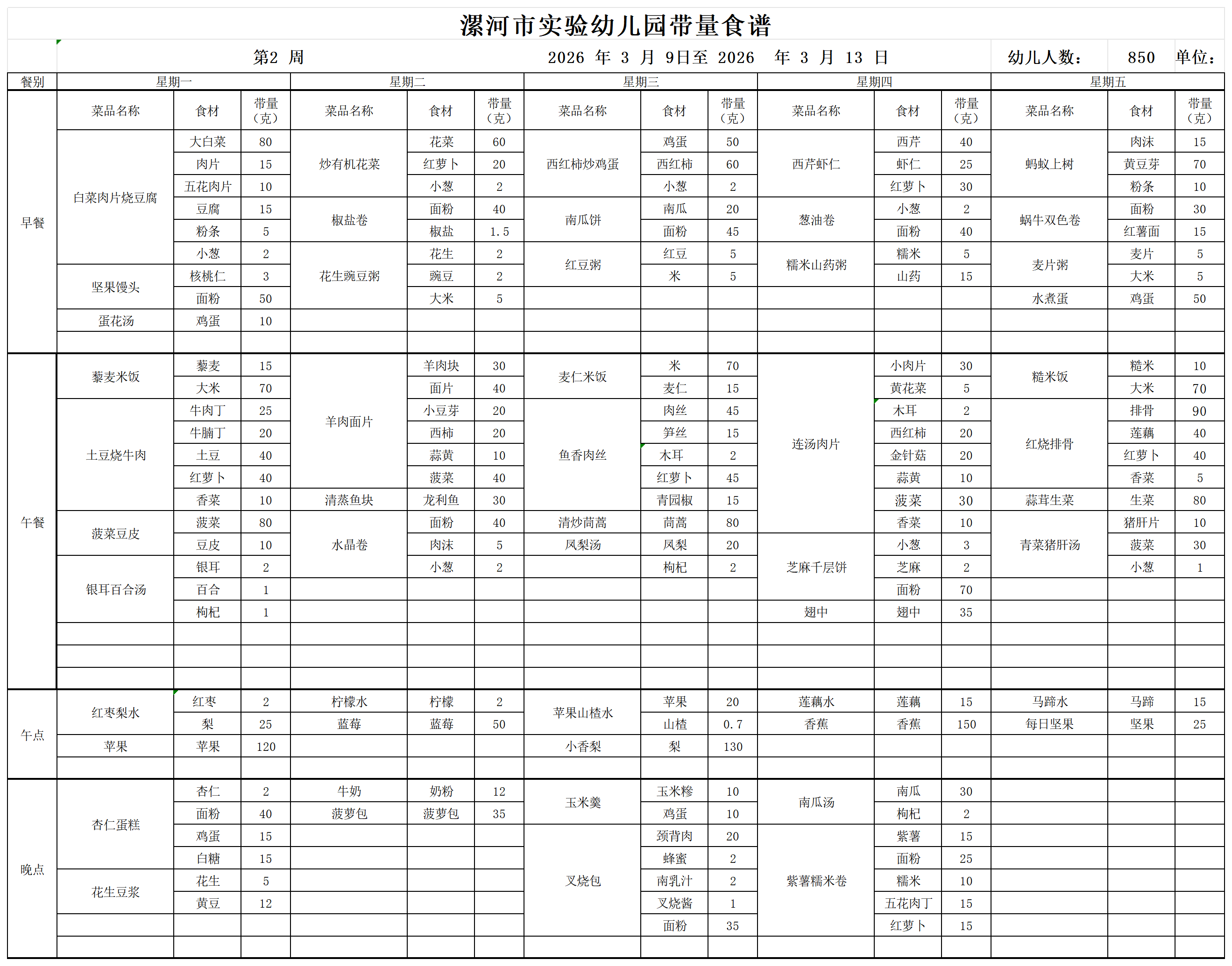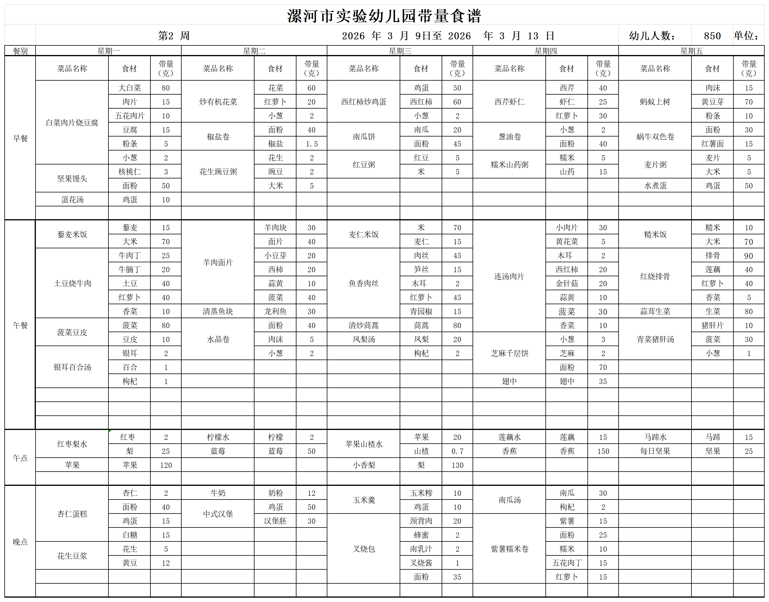 漯河市实验幼儿园3月9--13日带量食谱