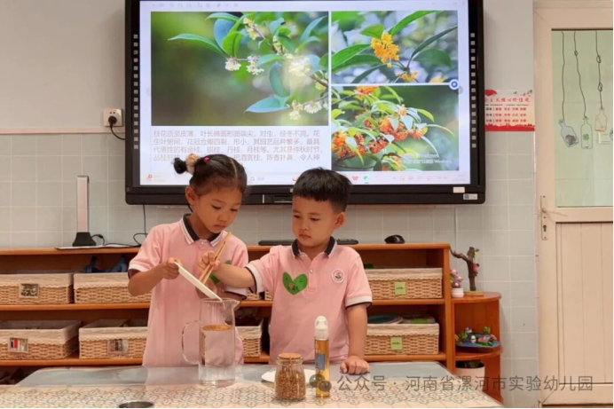 桂花蜜露饮是以桂花和蜂蜜为主要原料制成的饮品,兼具桂花芳香与蜂蜜的甘甜,具有润肺止咳、改善消化、美容养颜等功效,非常适合这个季节饮用。食育区角里,孩子们小心翼翼地将干桂花与蜂蜜按比例调和,倒入温水轻轻搅拌,看着金黄桂花在杯中旋转,忍不住惊叹:“好香呀!”最后将蜜露装瓶贴标,打造专属秋日的清甜饮品。
