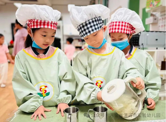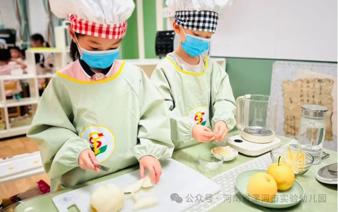 白露时节,燥气渐起,正是食养的好时机。幼儿园的“秋日厨房”里,孩子们化身小厨师,亲手制作应季美食——桂花蜜露饮和雪梨百合汤。