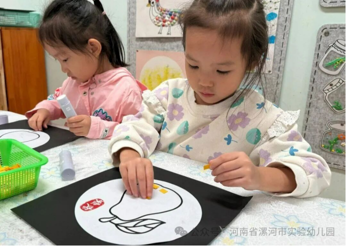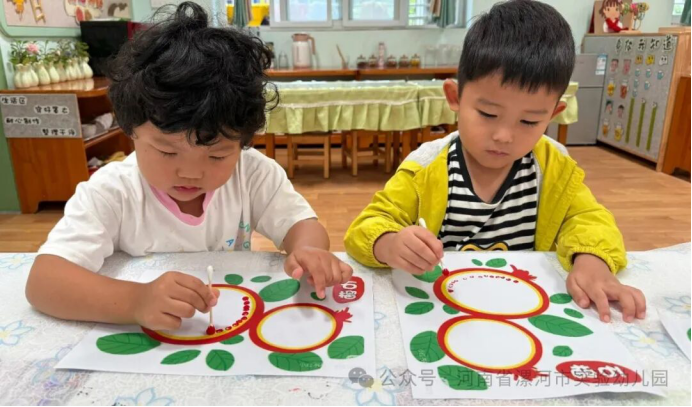 秋意渐浓,正是各种果子丰收的时候。老师备好画纸、颜料和手工纸,纸上印着果实轮廓图,引导孩子们用棉签、皱纹纸赋予它们更多的色彩。不一会儿,“石榴娃娃”、“秋梨图”就做好了,孩子们笑着将秋天的色彩与香甜画进了自己的作品里。