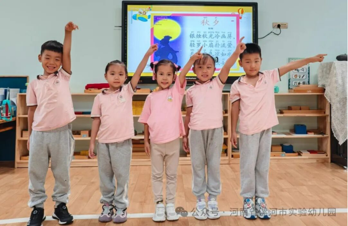 秋分的诗意,更在传统雅趣的氛围中弥漫。老师们选取《秋夕》中“天阶夜色凉如水,卧看牵牛织女星”的经典诗句,用童趣化的语言解读诗中秋夜纳凉、仰望星空的画面,孩子们一下就理解了诗中浪漫的秋日场景。