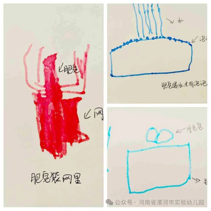 虽然初次尝试未成功,但孩子们没气馁,反而发现关键:肥皂能装起来,但“装的工具”得选对。同时,新疑问冒了出来:“干肥皂为啥没泡泡?”“洗澡用的网网能行吗?”