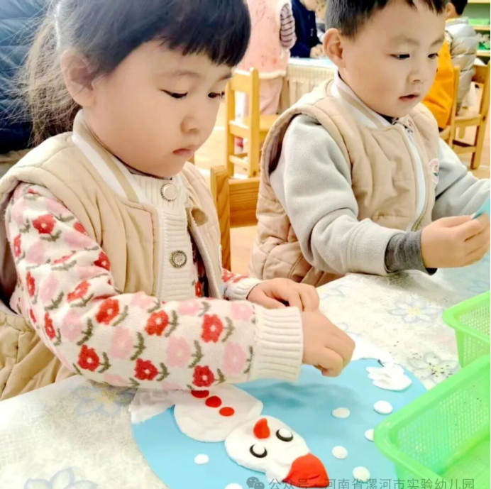 动手时光总是充满欢乐!中班的孩子们化身“冬日小工匠”,用各色黏土制作了雪人,一笔一画、一粘一贴,每一件作品都藏着孩子们天马行空的想象力与创造力。大班的孩子们则将食盐和颜料融合到一起做成彩色盐,轻轻撒在用胶水绘出的雪花轮廓上。随着画纸立起,一片片缤纷的雪花跃然纸上,创意定格冬日的美好。