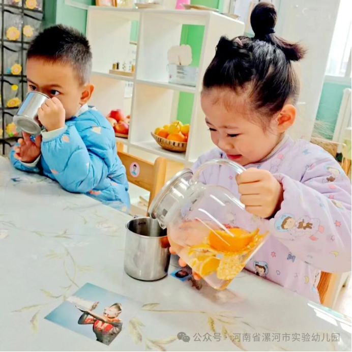小班孩子们亲手清洗橘子、细心剥去外皮,熬制清甜润喉的橘汤。看着橘瓣在热水中渐渐舒展、香气缓缓释放,等待的过程充满期待。喝上一口自己参与制作的橘汤,冬日的寒意仿佛也随之消散。孩子们在温暖体验中,也自然感知到大雪时节“暖身润燥”的饮食智慧。