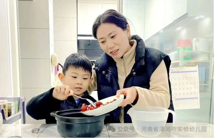 幼儿园还鼓励家庭参与,开展亲子食育活动。家长与孩子共同选购红豆、红枣、花生、枸杞、红糖等食材,一起清洗、熬煮“五红汤”。在亲子协作的温馨时光里,宝贝们不仅认识了各种温补食材,了解了五红汤“补气暖身”的功效,更在亲子互动中感受到陪伴的温暖。