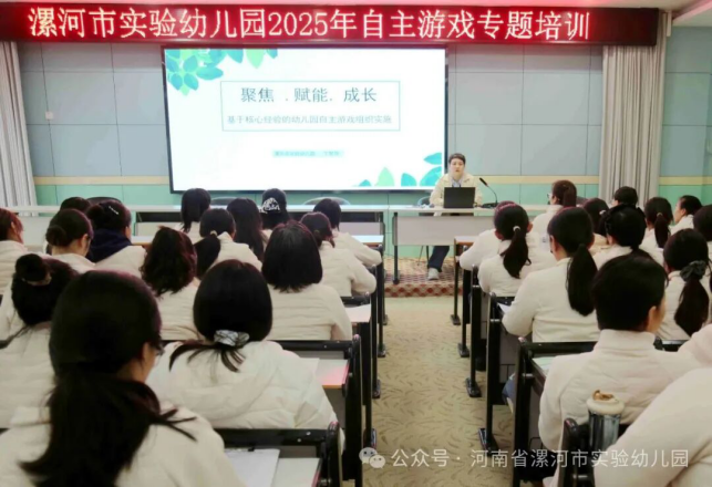 为深入贯彻《幼儿园保育教育评估指南》精神,进一步更新教师教育观念,提升教师组织、观察与指导幼儿自主游戏的专业能力,10月17日下午,漯河市实验幼儿园以“幼儿园自主游戏组织实施”为主题开展教师专业成长培训,通过理论引领与经验共享,赋能教师队伍专业素质提升。