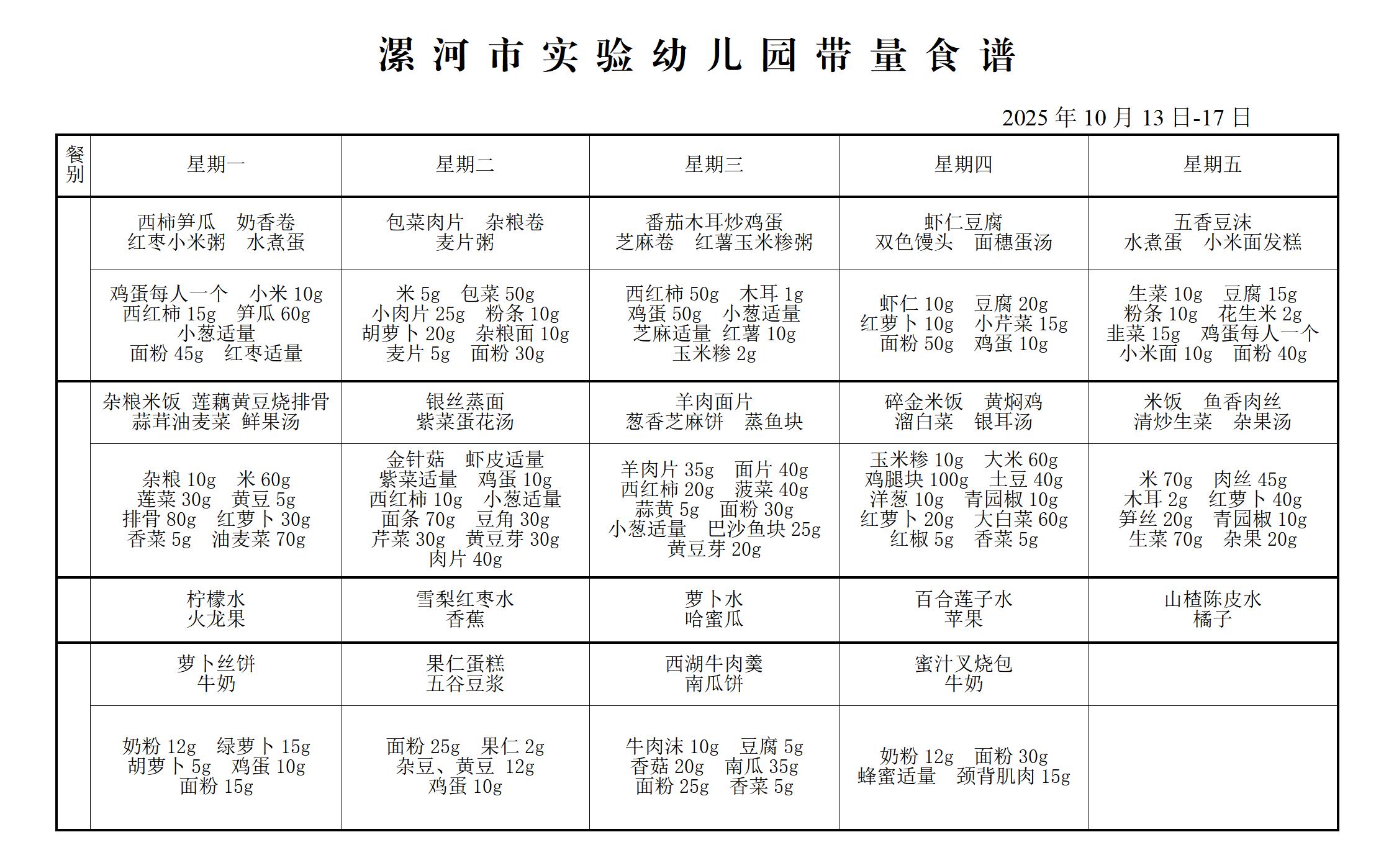 漯河市实验幼儿园10月13----17日带量食谱