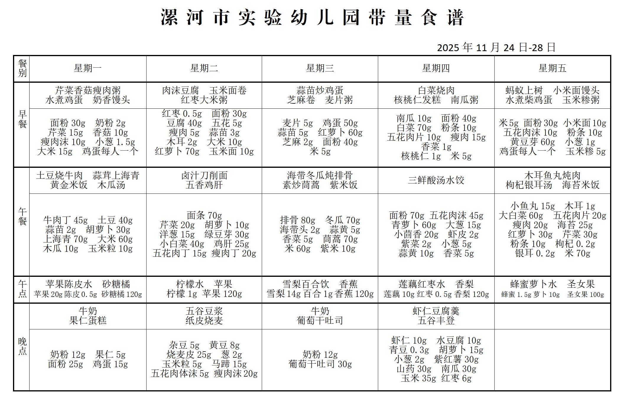 漯河市实验幼儿园12月1--5日带量食谱