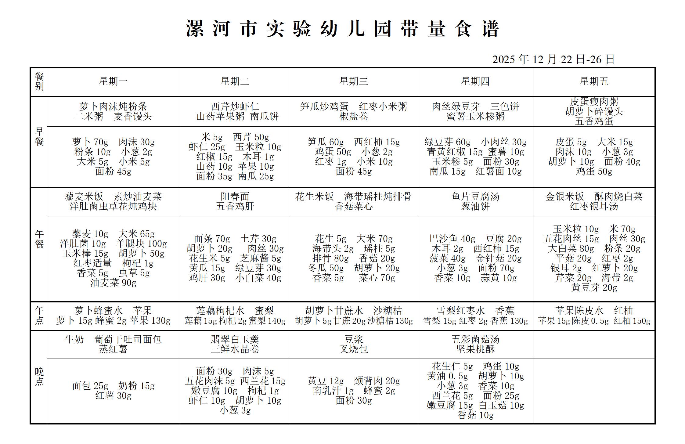 漯河市实验幼儿园12月22--26日带量食谱