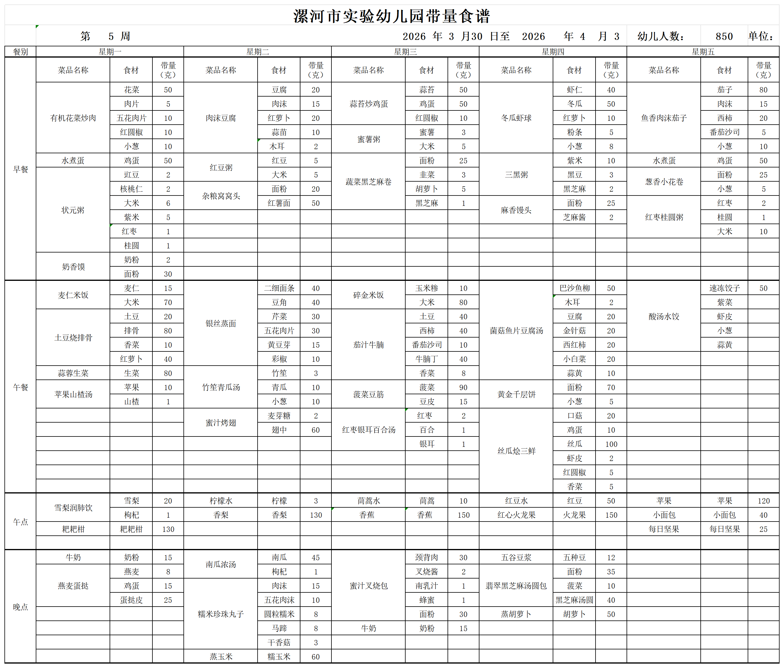 漯河市实验幼儿园3月30----4月3日带量食谱