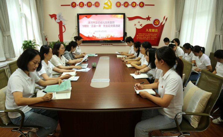2025年9月5日,漯河市实验幼儿园党支部开展了9月份“三会一课”暨主题党日活动,党支部书记潘伟红主持会议,支部委员和在职党员现场参会,离退休党员干部线上同步参与活动。