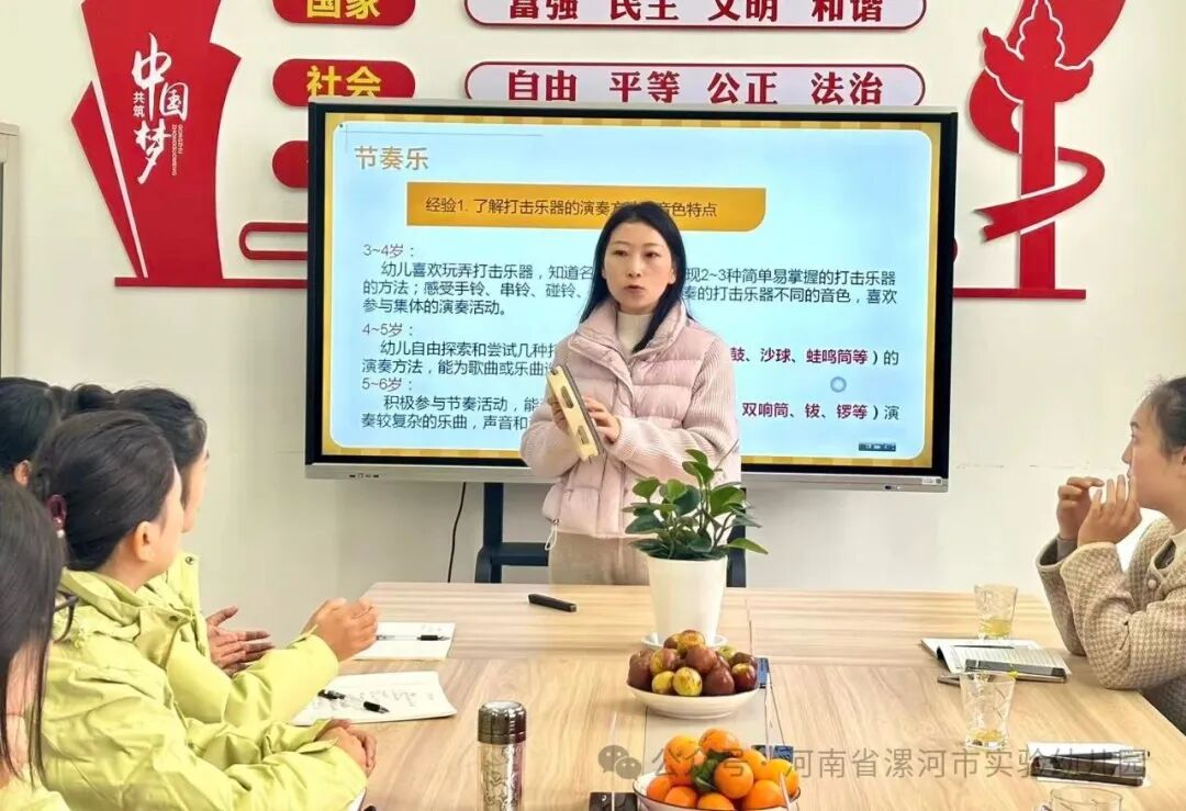 李娜老师作《幼儿园奏乐活动的组织与实施》专题教研,围绕活动设计、乐器选择、教学引导等方面进行细致讲解,为在场教师提供了清晰的教学思路。