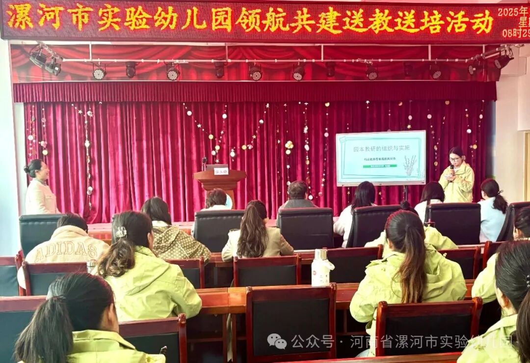 为深入贯彻落实《河南省幼儿园领航共建“1235”工程实施方案》文件精神,充分发挥省级领航幼儿园的示范引领作用,2025年10月24日——25日,漯河市实验幼儿园组织骨干教师团队分赴三地,开展为期两天的“领航共建”送教送培活动。活动聚焦各园实际需求,通过优质示范课展示、专题教研及经验交流等形式,为共建园所注入了前沿教育理念与可操作实践的新动能。聚焦打击乐教学 深耕教研实效漯河市实验幼儿园保教主任丁梦 萍带领中原名师谌玉晓、教研组长李娜和骨干教师陈晶,奔赴信阳市新县潢河幼儿园开展送教送培活动。陈晶老师带来了大班奏乐活动《郊游》,她以生动有趣的情境导入,引导孩子们在感知音乐节奏的基础上,灵活运用打击乐器演绎乐曲,充分激发幼儿在音乐活动中的主动性与创造性。